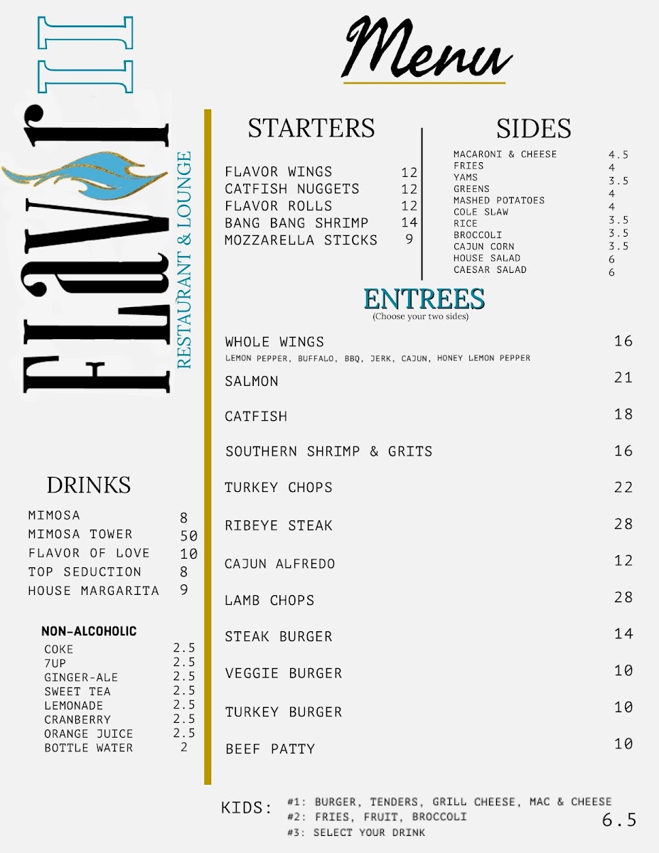 At Flavor 2 Menu, located at 317 E 200th St in Cleveland, OH, you’ll find a menu that’s all about delicious variety. Whether you’re in the mood for something light or looking to indulge in something hearty, there’s something here to satisfy every craving. From fresh, vibrant salads to tender, juicy meats and everything in between, the options never disappoint. The flavors are rich, the ingredients fresh, and the dishes come together in a way that keeps you coming back for more.