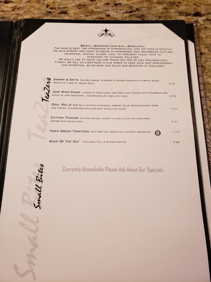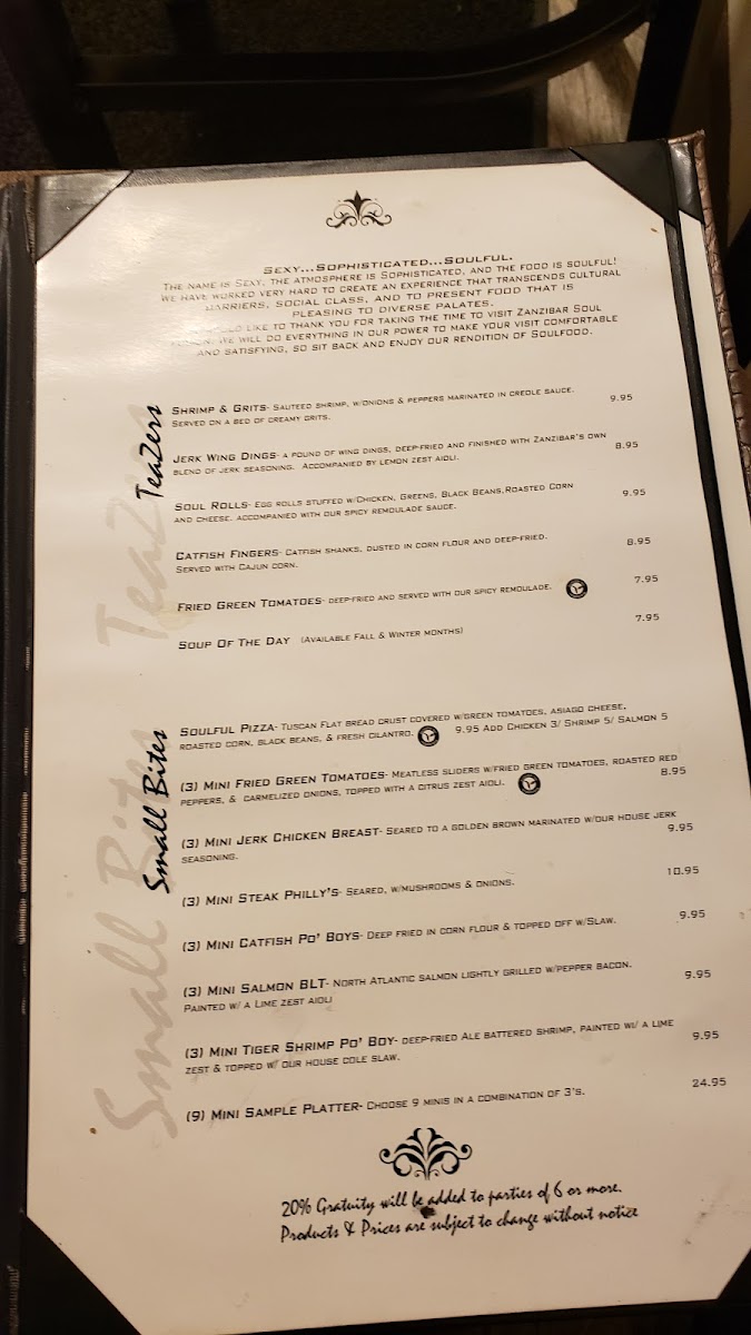 A pound of wing dings, deep-fried and finished with Zanzibar's own blend of jerk seasoning. Accompanied by lemon zest aioli.